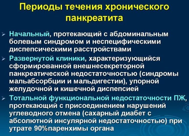 Симптоматика при хронической форме болезни появляется периодически, в основном — в моменты обострений. На протяжении первого десятилетия течения панкреатита признаки патологии выражены неярко, и носят эпизодический характер. Когда этот этап позади, пациент постоянно испытывает симптомы панкреатита.